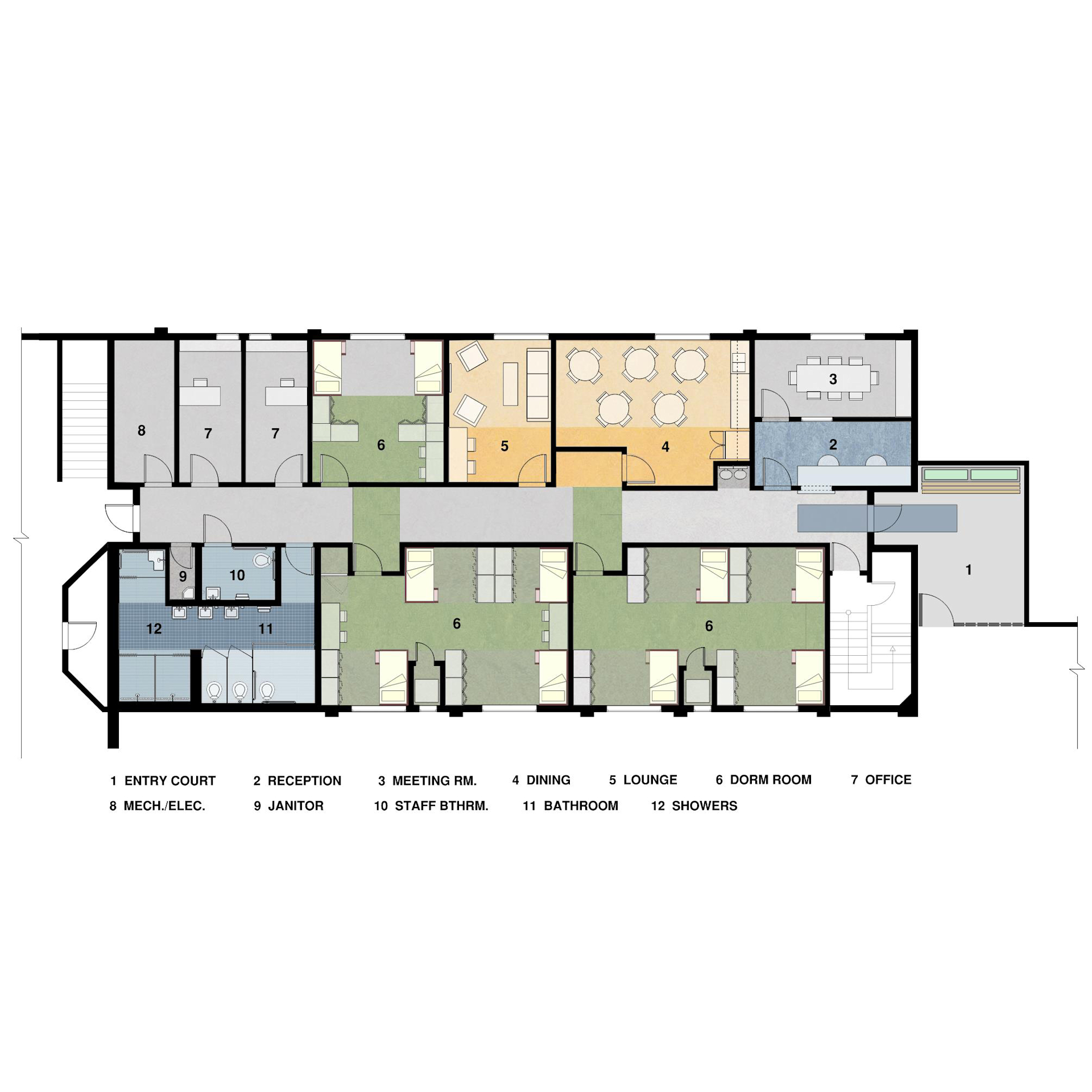With a tight budget, the design team reconfigured small classrooms into dorm rooms for 4 to 8 residents. Each room is arranged in a series of “pods” for varying levels of privacy using existing elements and new storage components. Each room is naturally lit and incorporates egress windows, in-room laundry facilities, and space for shared desks.